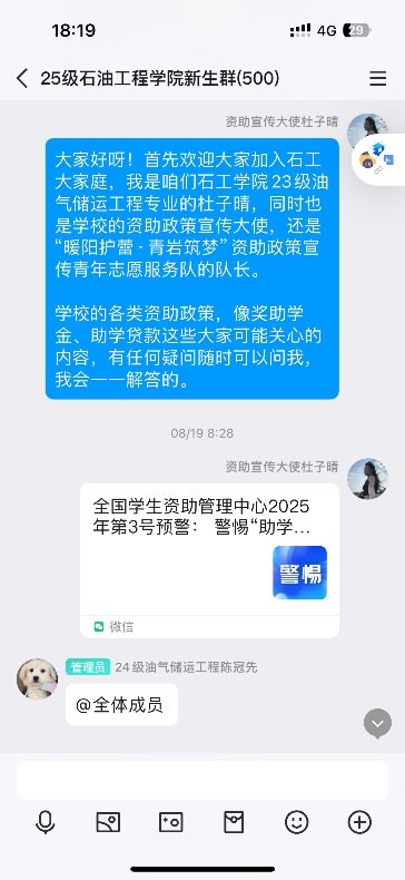为切实将学生资助政策精准送达新生群体,帮助新生及家长全面了解资助政策、消除入学顾虑,队员们通过学院各专业新生群,开展线上资助政策咨询与知识转发活动,以专业服务为新生搭建起政策了解的“绿色通道”。队员们提前梳理政策要点,转化为易懂的图文材料,通过群公告、群文件等方式广泛传播。他们实时在线,耐心细致地解答新生及家长关于助学贷款、助学金申请等高频问题,确保政策信息精准送达,为其顺利入学保驾护航。