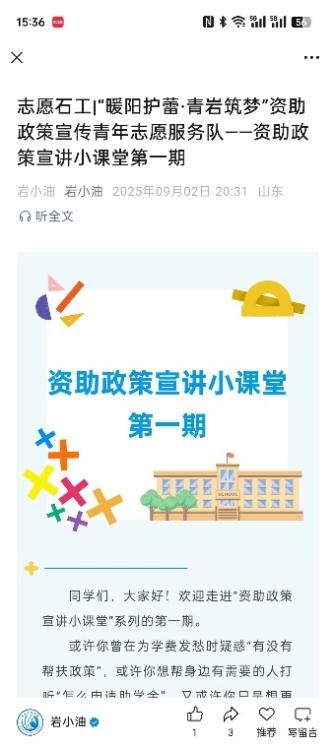 习近平总书记强调:“教育公平是社会公平的重要基础,要不断促进教育发展成果更多更公平惠及全体人民,以教育公平促进社会公平正义。”为深入贯彻落实国家学生资助政策,助力教育公平,护航青少年成长成才,山东石油化工学院“暖阳护蕾·青岩筑梦”资助政策宣传青年志愿服务队利用暑假时间,以高度的社会责任感与青春热情,深入城乡基层,积极宣传国家学生资助政策,旨在将国家关怀精准送达每一个有需要的家庭,切实为经济困难学子扫清求学路上的障碍。