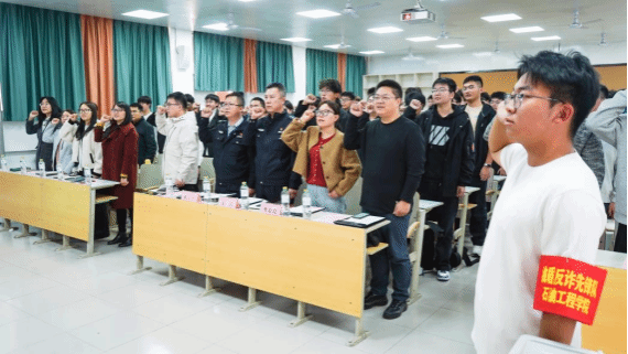 11月13日上午,石油工程学院“防诈反诈安全月”启动仪式暨“油盾反诈先锋队”成立仪式在第四教学楼举行。驻校民警张涛所长、成玉平警官,学院副院长李聪聪,学院全体辅导员、反诈宣传员、学生代表等90余人参加仪式。