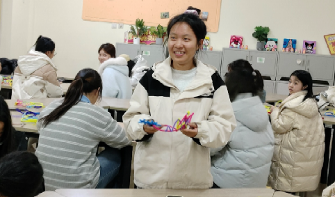随后进入自由创作环节,大家运用扭扭棒尽情发挥想象力,将缕缕彩丝编织成一件件独具巧思的手工作品。活动尾声,同学们依次上台展示成果,并分享了作品背后所寄托的心情故事与美好寓意。一个个真诚的讲述引发了阵阵共鸣,现场洋溢着温暖与感动。