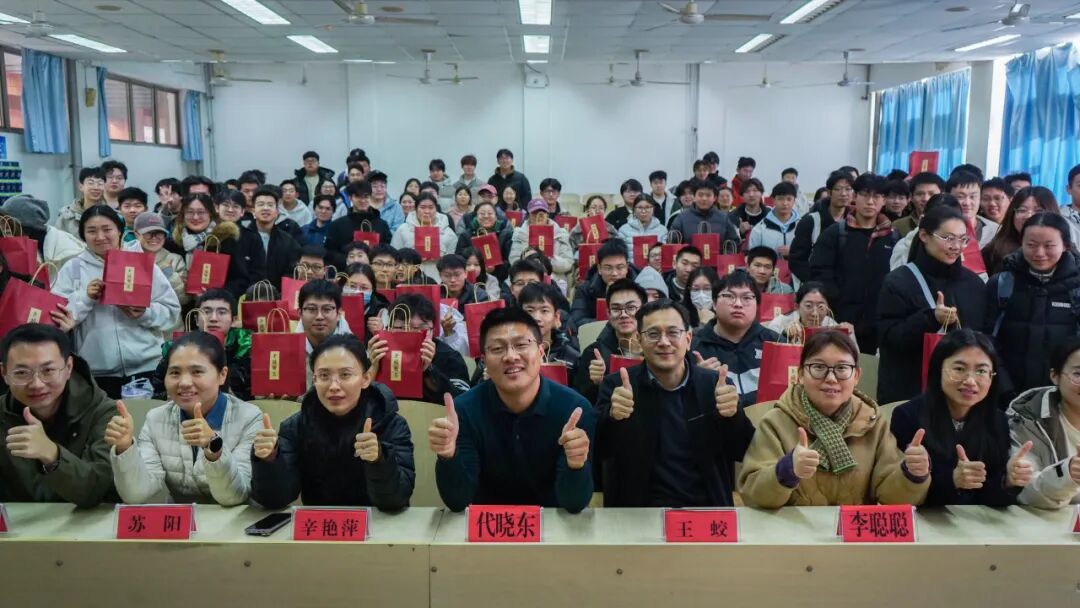 代晓东院长作总结讲话,他勉励同学们以石油人的坚韧与执着,钻透知识岩层,汲取智慧能源,祝愿大家金榜题名。现场掌声雷动,气氛热烈感人。寄语环节后,各位考研学子纷纷查收暖心大礼包,脸上洋溢着感动与振奋的笑容。