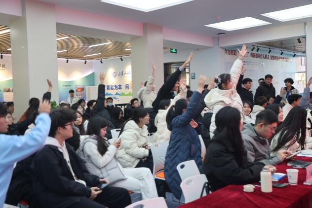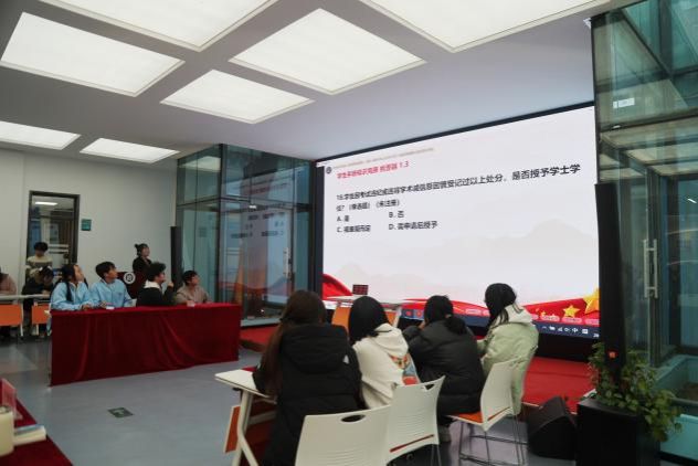 决赛现场气氛热烈而紧张,竞赛设置三个环节,依次为12进6抢答、6进3抢答以及论述题环节。比赛题目来自《学生手册》,包含学生管理、教学管理、助学服务、成长指导四个篇章共计36项制度文件,涉及学生违纪处理、评优评先、考试管理规定等多方面内容。在抢答题环节,各参赛队伍眼疾手快,竞争激烈,比分交替上升;论述题环节更是考验了选手们的扎实理论功底与实践运用能力。工作人员核算比赛分数的间隙,在场观众积极参与互动答题,赢得精美礼品,将比赛氛围推向高潮。