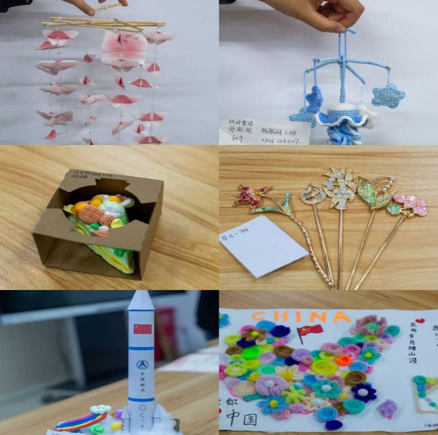 “宿舍创意手工DIY”活动:本次活动中,同学们以寻常材料织就寝居暖意:学16-704用金属簪杆、彩釉饰片制出嵌着花叶的发钗,鎏金里藏着雅致;余硕以扭扭棒缠出“我爱你中国”的爱心花景,裹着炽热心意;王振华用纸艺塑出带国旗的航天火箭,载着星空向往;张静以彩纸、竹条折出蝶形风铃,轻摇流光曳动;郭湘湘用蓝白毛线织就水母星型风铃,柔润了宿舍氛围;还有彩泥捏成的鲜果摆件,成了桌面鲜活点缀。室友们协作间,材料揉进心意,让宿舍成了藏着热爱的“小世界”,将青春暖意定格在每处角落。