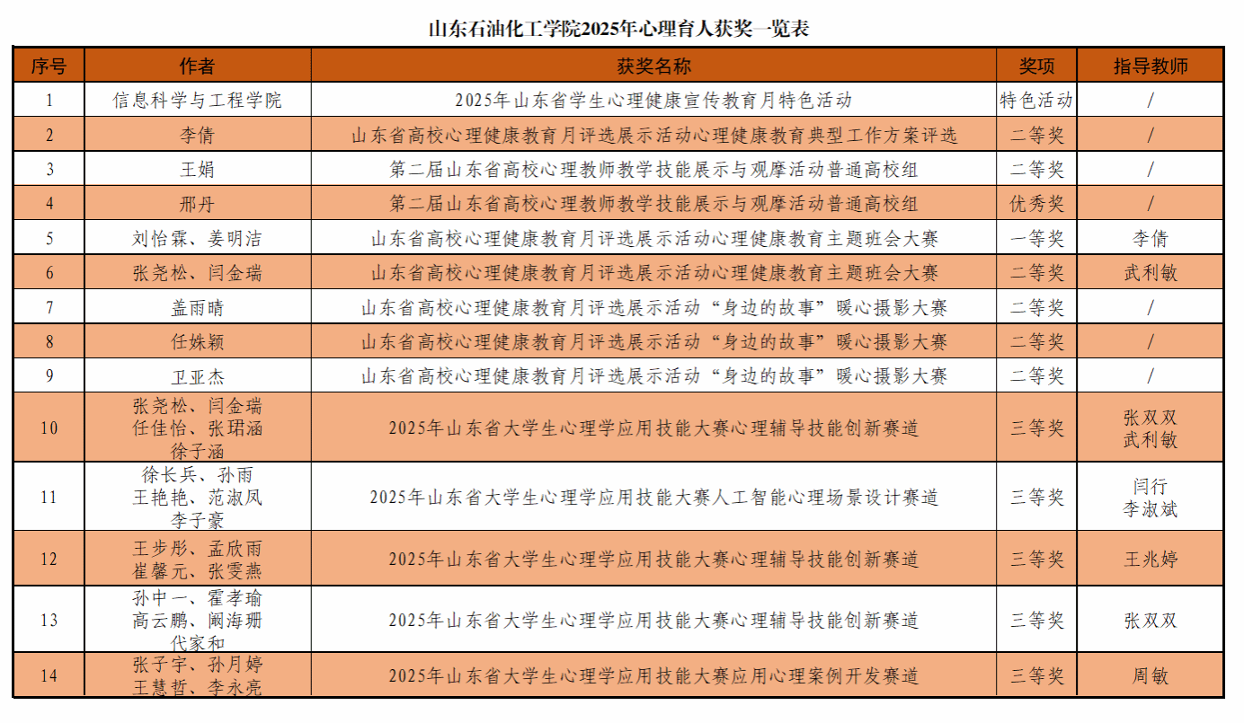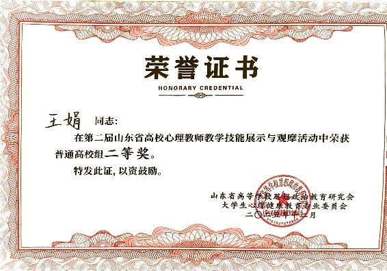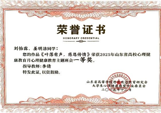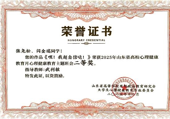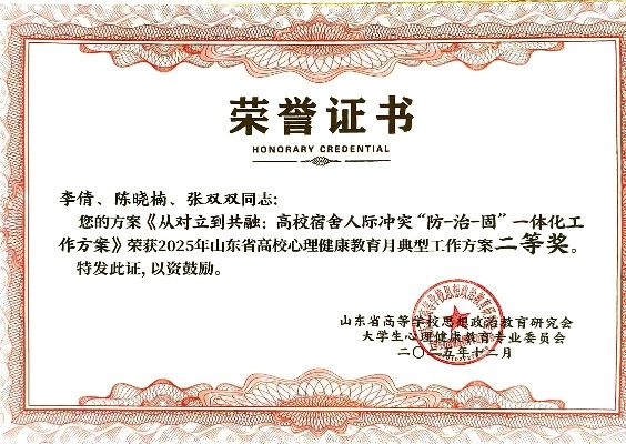 在由山东省大学生心理健康教育专业委员会主办的2025年山东省高校心理健康教育月评选展示活动中,我校师生取得多项荣誉。其中,王娟老师在第二届山东省高校心理教师教学技能展示与观摩活动中荣获二等奖,李倩老师的“心理健康教育典型工作方案”获评二等奖,刘怡霖(指导教师:李倩)、张尧松(指导教师:武利敏)在“心理健康教育主题班会大赛”中分获一、二等奖,盖雨晴、任姝颖、卫亚杰在“身边的故事”暖心摄影大赛均荣获二等奖,展现出我校师生在心理育人实践中的优秀水平。