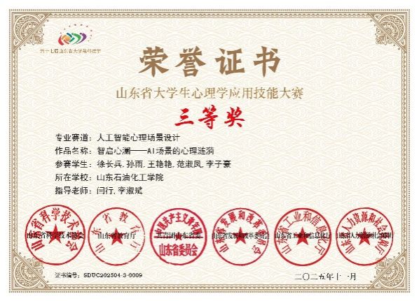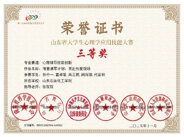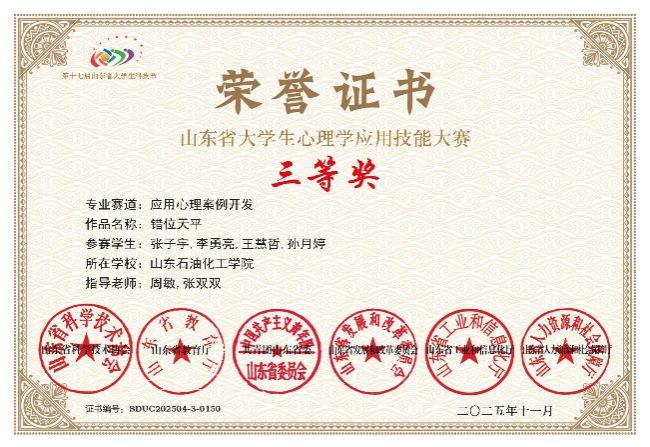 在由山东省科学技术协会、山东省教育厅等六部门联合主办的第十七届山东省大学生科技节——2025年山东省大学生心理学应用技能大赛中,我校五组参赛队伍取得三等奖,显示出我校在心理学应用技能培养方面的广泛基础和有效训练。
