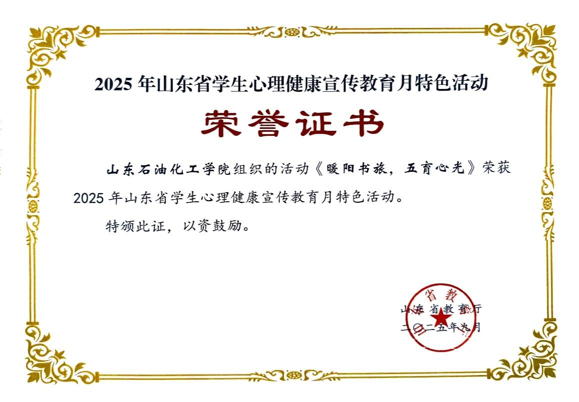 在山东省教育厅举办2025年山东省学生心理健康宣传教育月特色活动评比中,我校报送、由信息科学与工程学院组织的《暖阳书旅,五育心光》活动被认定为省级“特色活动”,反映了我校在心理健康教育领域的系统推进与组织能力。