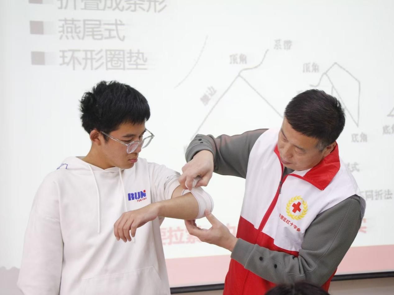 本次培训由东营区红十字会崔轩慈老师主讲。培训现场,他围绕心肺复苏操作规范、各类创伤包扎技巧等核心内容展开讲解,并结合生活中突发意外案例,细致拆解急救关键节点与操作误区。理论学习后,同学们借助模拟教具分组开展实操练习,老师们逐一巡视指导,确保每位同学掌握急救标准流程。培训中,老师们还同步开展了红十字知识竞赛、遗体角膜器官捐献知识宣讲等环节,并进行理论考试与实操打分,全方位检验同学们的学习成效。