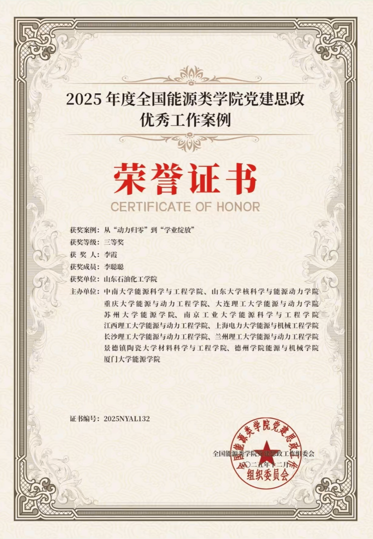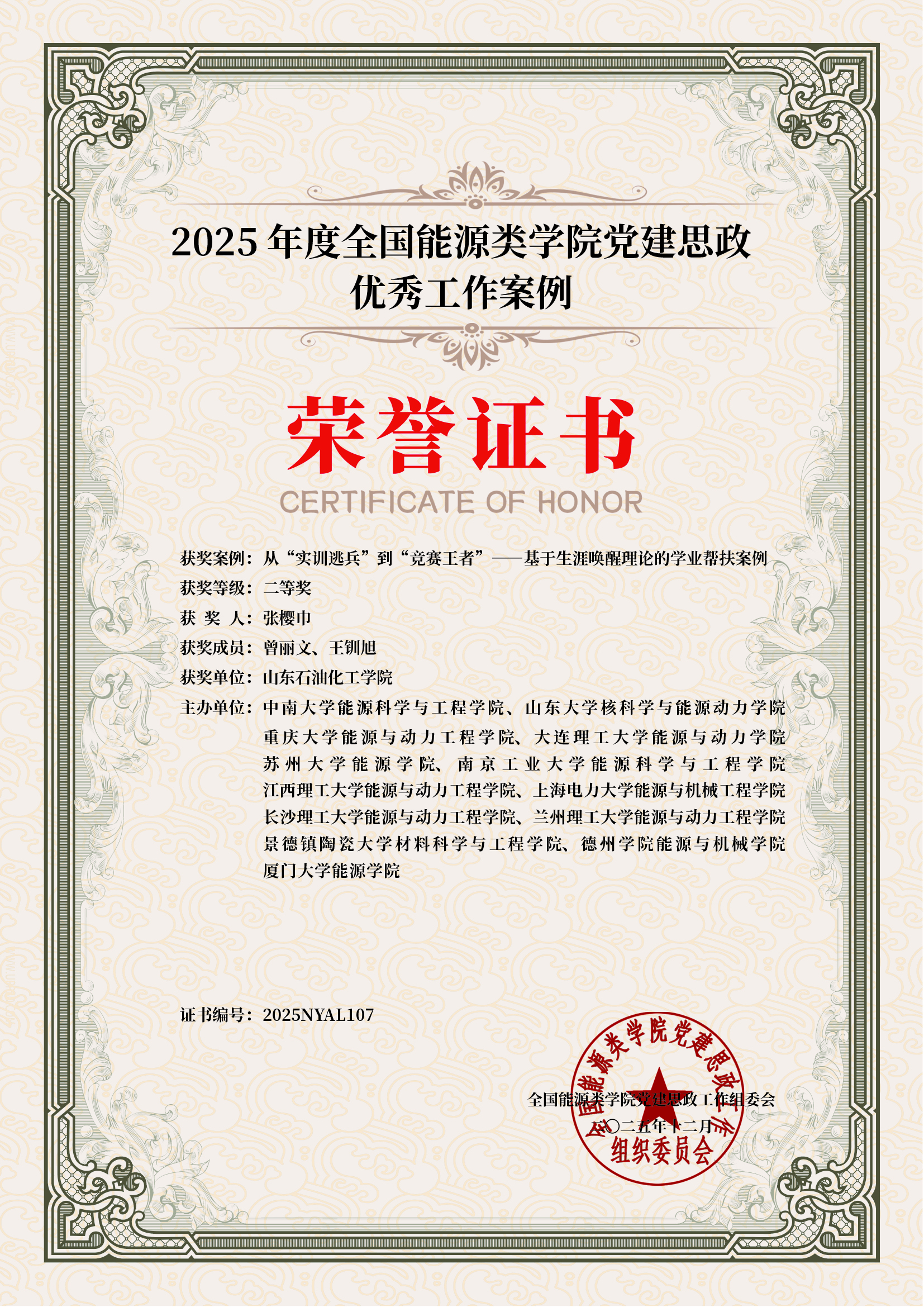 12月10日,全国能源类学院党建思政工作组织委员会公布了2025年度全国能源类学院党建思政优秀工作案例获奖名单。经专家评审,石油工程学院辅导员张樱巾获二等奖、辅导员李霞获三等奖。
