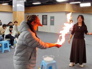 当日下午,学校排练厅内,“冬日序曲,暖意共鸣”团建活动火热开场。团队成员带来“火焰掌”实验,精彩演示引发现场阵阵惊叹,瞬间点燃气氛。随后,“进击的剪刀石头布”环节展开,同学们在趣味对决中尽显协作与欢笑。猜歌识曲环节再掀高潮,大家踊跃抢答,歌声掌声交织回荡。