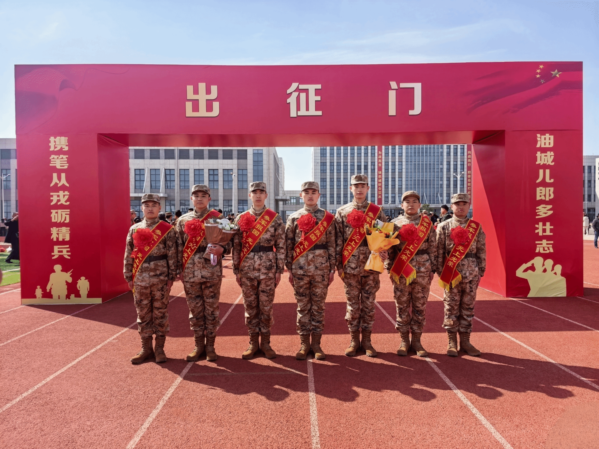 欢送仪式现场,即将入伍的新兵们肩披鲜红绶带,胸戴大红花,精神抖擞。我校辅导员及退役复学大学生代表参加了欢送活动,向即将踏上保卫祖国征程的同学们表示热烈祝贺。
